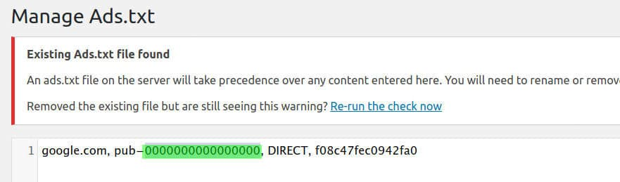 As you can see in the image above, the plugin found an existing ads.txt file on my server so it won’t read in the contents of that file, or overwrite the contents of the physical file.
